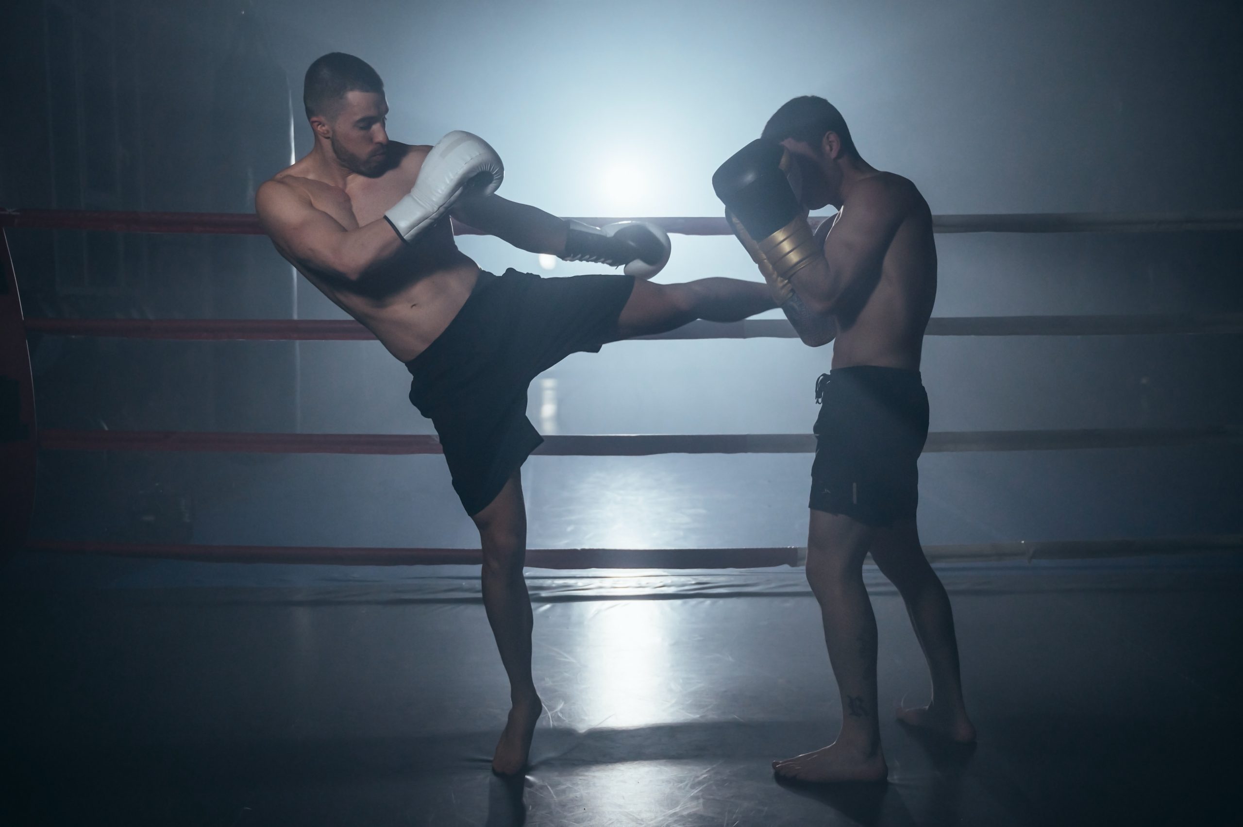 Two shirtless muscular man fighting Kick boxing combat in boxing ring. High quality photo
